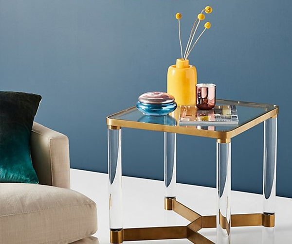 Втори дизайн: Тук отново имаме наситена синя стена, но тя е комбинирана с прозрачната лекота на плота от стъкло и акрилните крака на масичката. Златните елементи отново изпъкват и придават шик и стил.