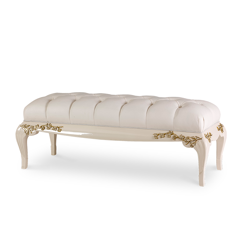 Класическа бяла пейка с капитонирана седалка и ръчно декорирани златни елементи. Перфектен завършек за спалня, антре или тоалетка.