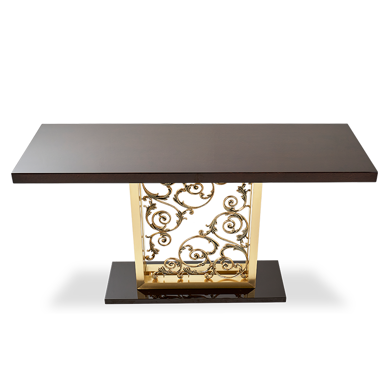 Изискана и артистична, тази конзолна маса е създадена да впечатлява. Перфектен акцент за елегантно антре, хол или коридор, тя съчетава класическа естетика с модерна изработка. Позлатената орнаментна основа внася усещане за стил, а плотът в тъмно дърво придава завършеност и контраст.