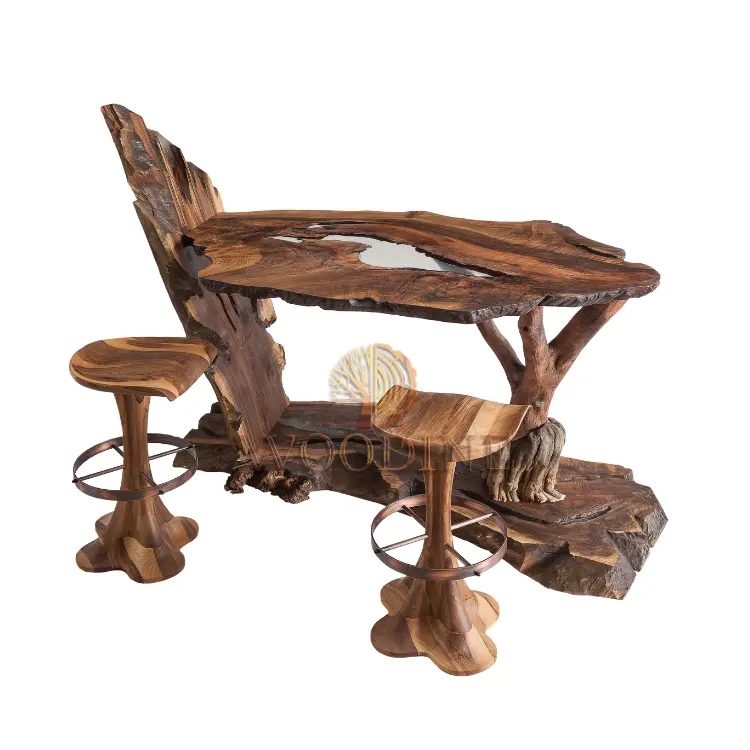 Комбинира органичната текстура на масивното дърво с ръчно изработени детайли от корени и епоксидна смола. Бар плотът впечатлява с природна структура, докато столовете осигуряват лукс и стабилност. Подходящ за частни домове, хотели или заведения с характер. Предлага топла атмосфера и уникално изживяване за вашите гости.
