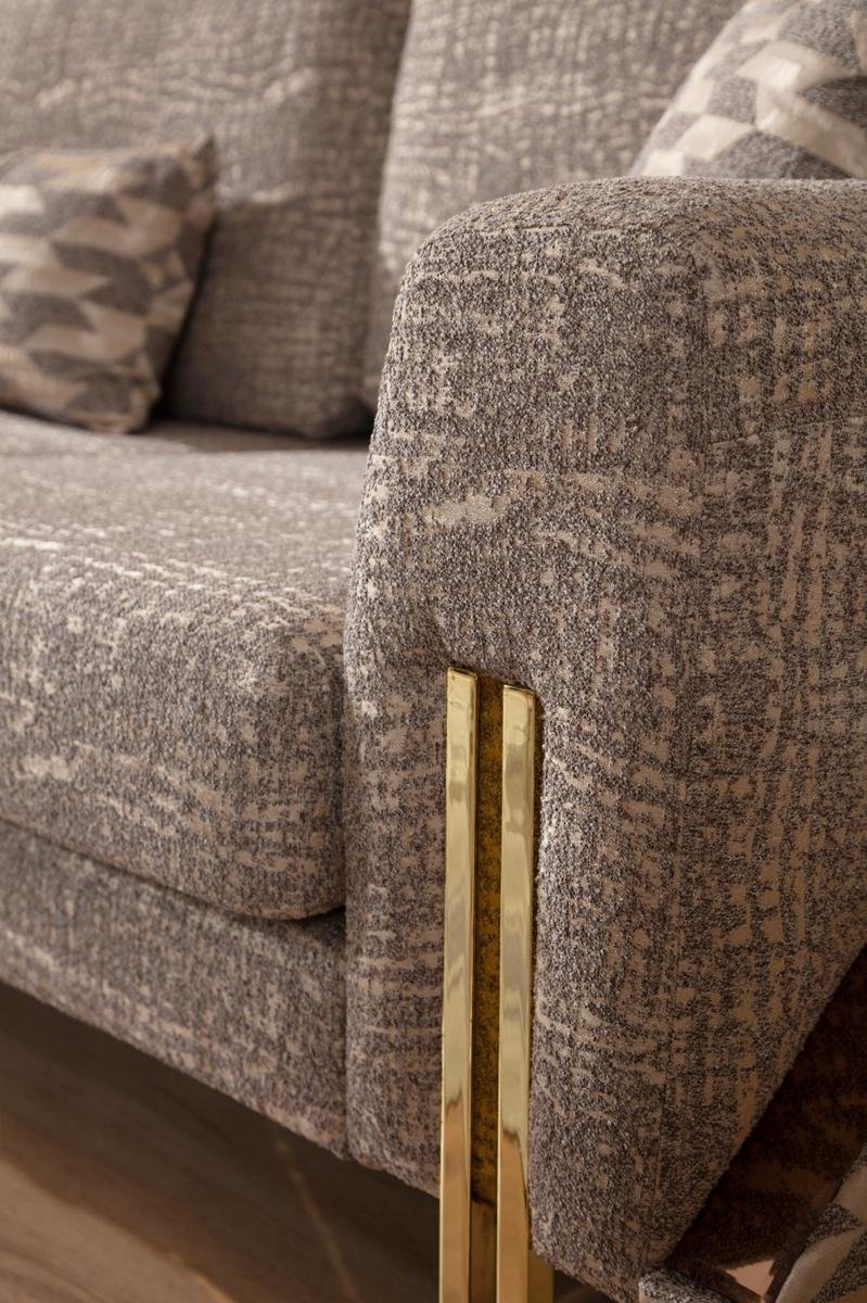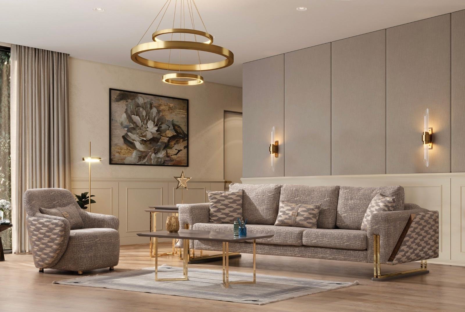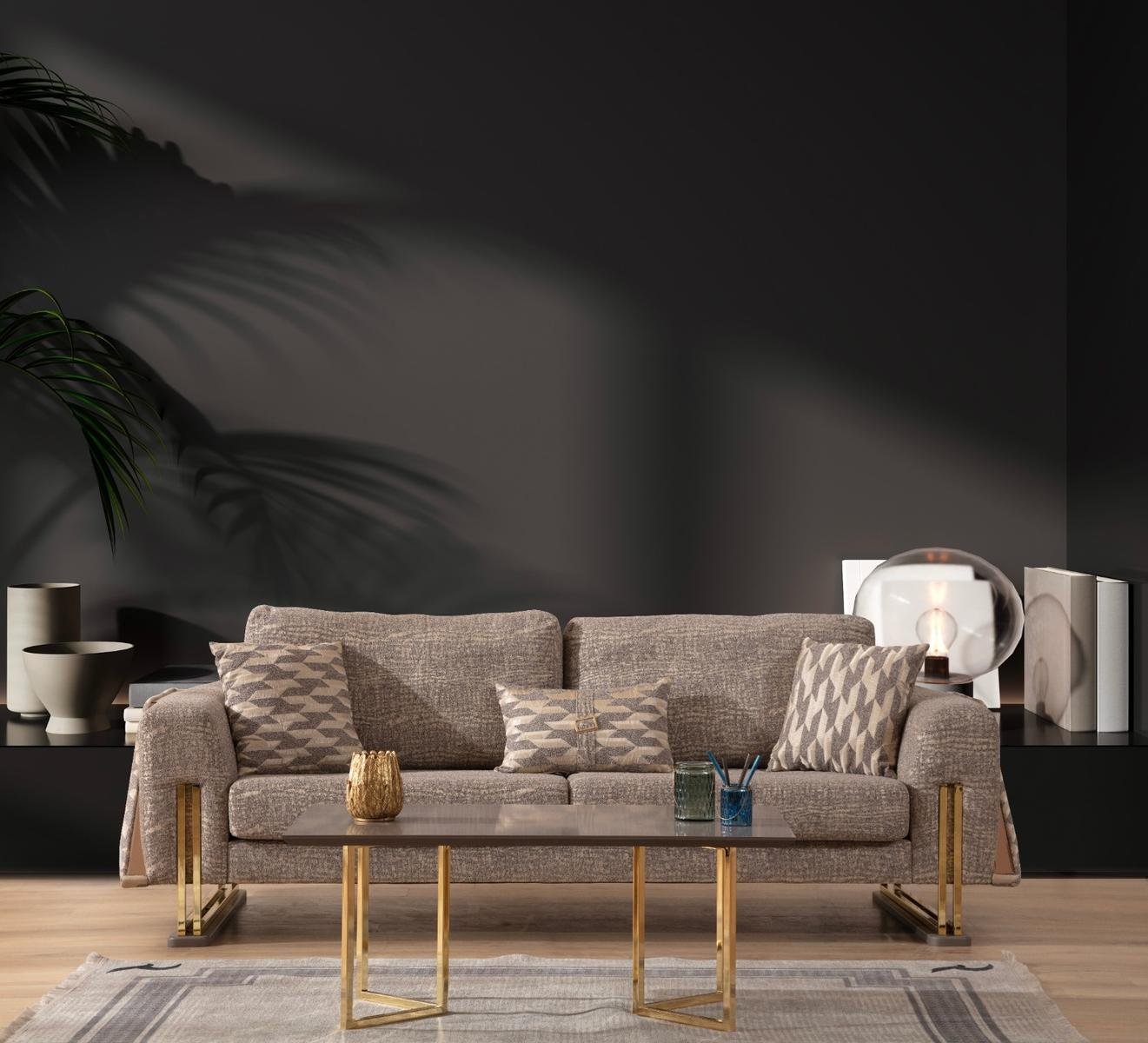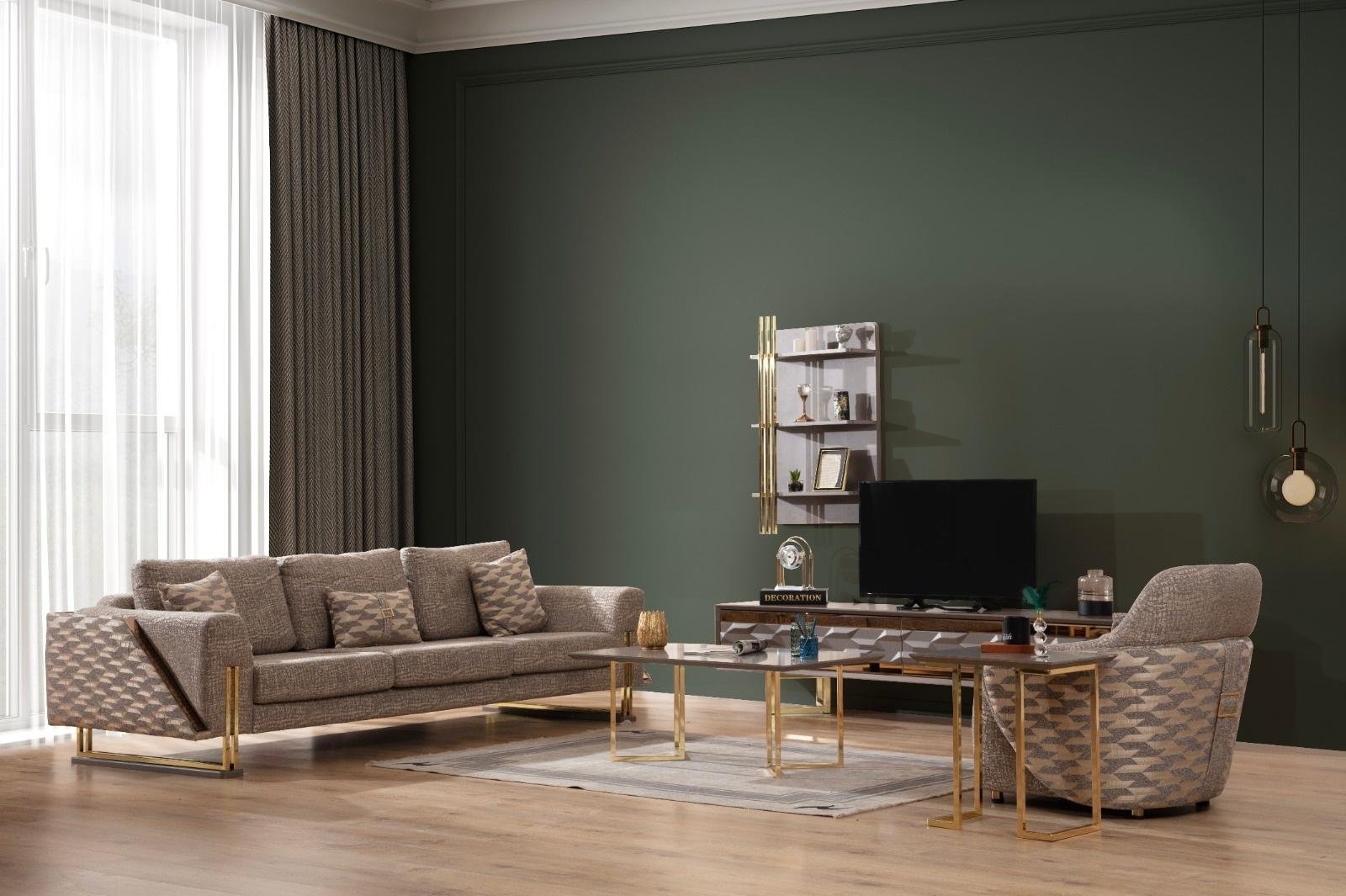 Gallina Луксозен холов комплект съчетава съвременна естетика с безупречен комфорт. Комплектът включва двуместен и триместен диван, както и удобен фотьойл – всички с висококачествена кадифена тапицерия, декоративни възглавници и фини крака със златист завършек.