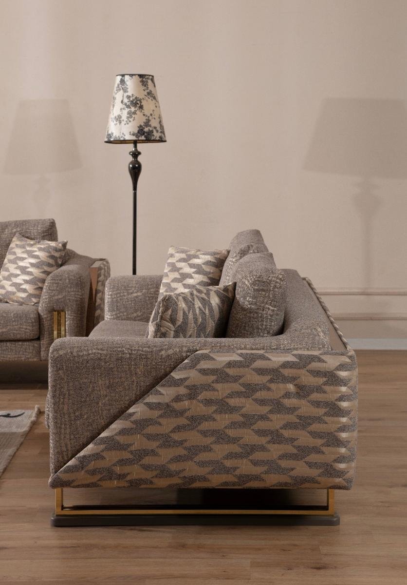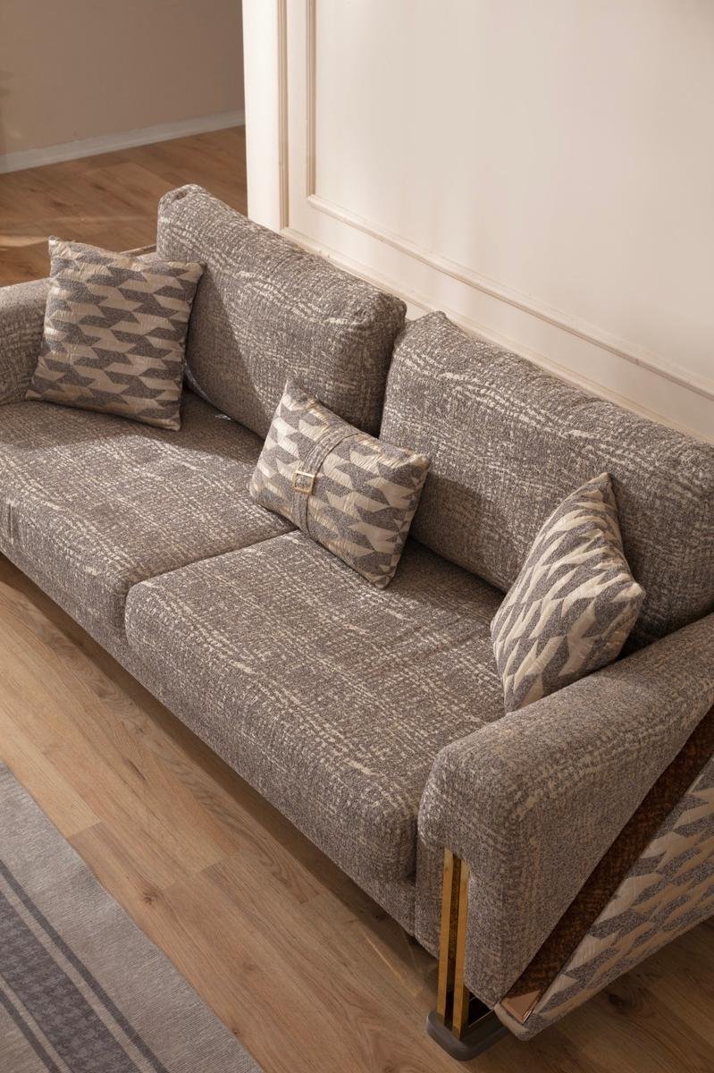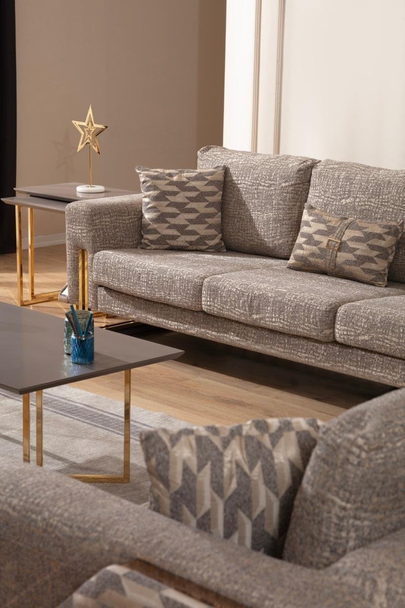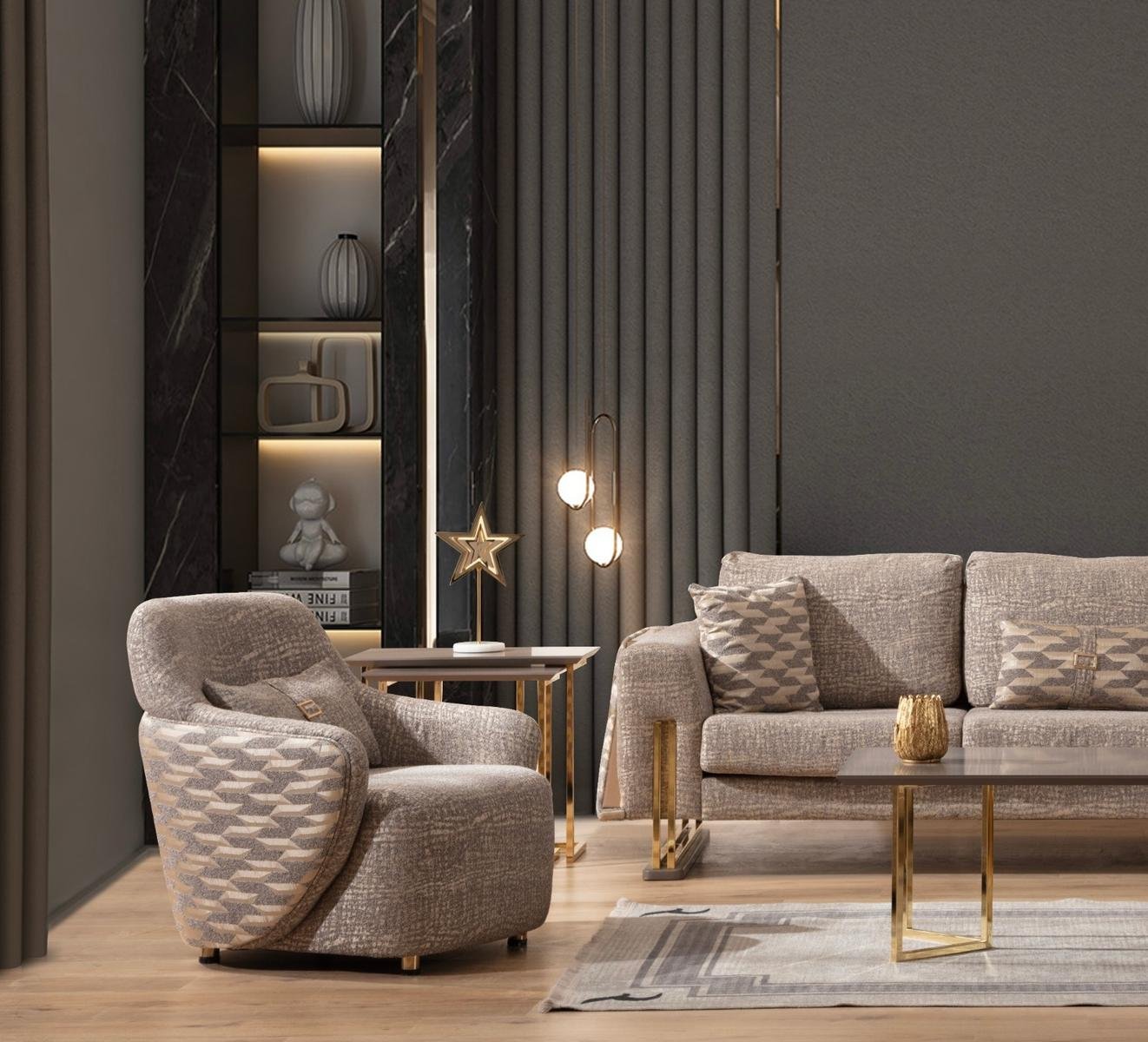 Gallina Луксозен холов комплект съчетава съвременна естетика с безупречен комфорт. Комплектът включва двуместен и триместен диван, както и удобен фотьойл – всички с висококачествена кадифена тапицерия, декоративни възглавници и фини крака със златист завършек.
