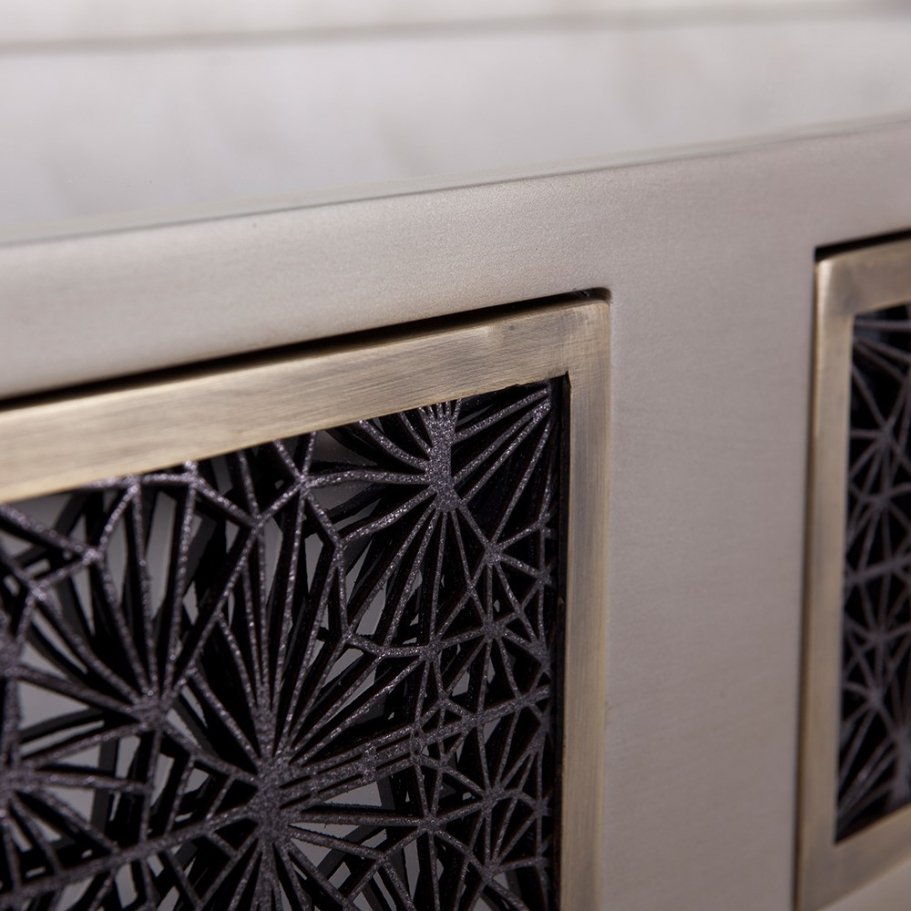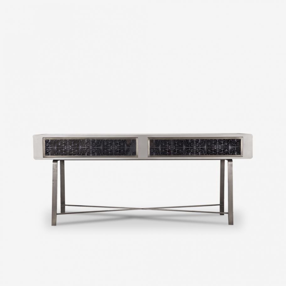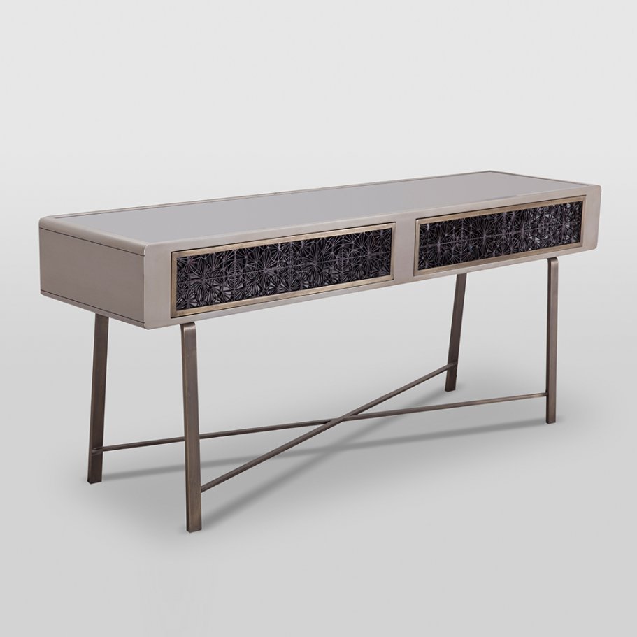Корпусът е от дърво, облицован с кожа с релеф Birdnet в цвят Effete Black Gun, съчетана с опушено огледално стъкло за дълбочина и визуален акцент. Металните крака в антик месинг придават стабилност и индустриална нотка. Конзолата разполага с два широки шкафа, което я прави не само стилна, но и функционална.