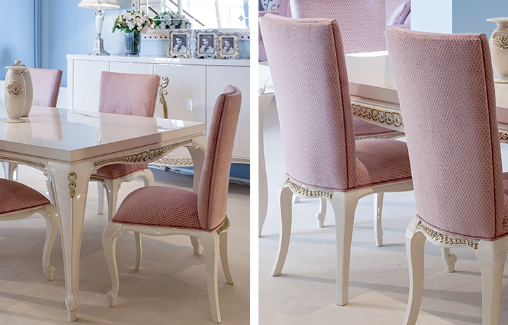 Изискан стол с елегантна розова дамаска и фино орнаментирана дървена рамка в бяло с позлатени детайли. Идеално допълнение към класически интериори – трапезария, салон или спалня с френски чар.